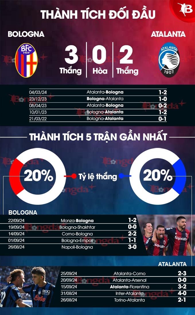 Chiến thắng tại Monza tuần trước đã giúp Bologna giải tỏa áp lực, trong khi Atalanta đang vật lộn với lịch thi đấu dày đặc tại Champions League. Với một lực lượng bị sứt mẻ, liệu nhà ĐKVĐ Europa League có thể lấy lại phong độ trước Bologna đang lên cao?