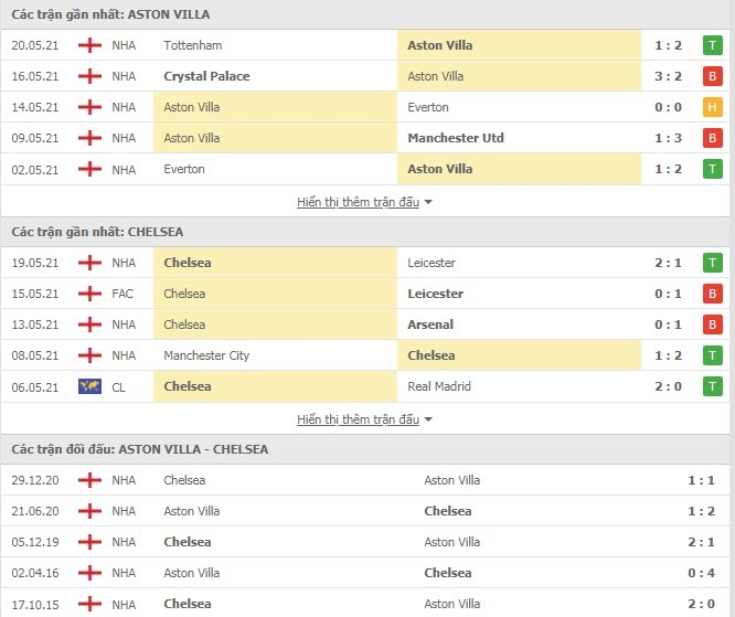 Thành tích đối đầu gần nhất của cả Aston Villa và Chelsea