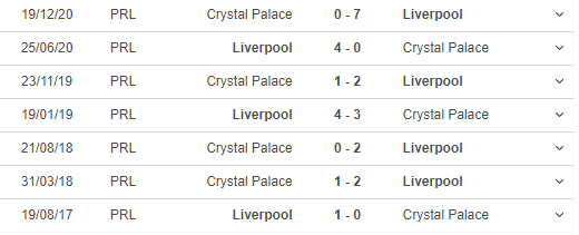 Trong 2 trận đối đầu gần nhất, Liverpool đã giành được những chiến thắng giòn giã trước Crystal Palace, với tổng tỉ số là 11-0. Crystal Palace cũng chỉ giành được 1 chiến thắng trong 5 trận làm khách gần nhất. Nhiều khả năng trận đấu sẽ kết thúc với 3 điểm cùng một tỉ số ấn tượng dành cho Liverpool.