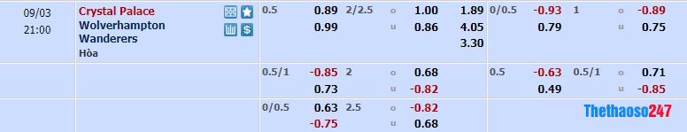 HT: Crystal Palace*2.58; Hòa*2.00; Wolves*4.70