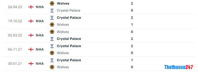 Trong 10 lần gặp nhau gần đây nhất, Crystal Palace đang gặp khó khăn hơn với 3 chiến thắng, trong khi Wolves đã giành được 5 chiến thắng và 2 trận còn lại kết thúc với kết quả hòa. Đáng chú ý, trong số này có 3 trận thuộc giải đấu FA Cup, trong đó Crystal Palace thắng 2 trận và Wolves thắng 1 trận.
