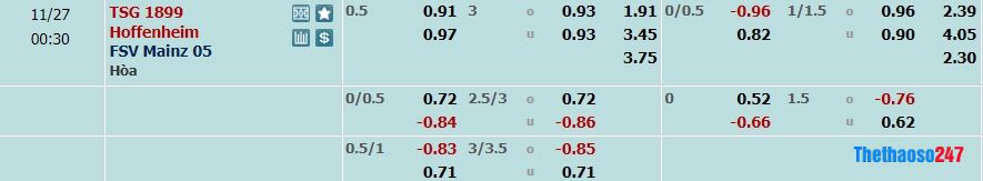 HT: Hoffenheim*2.39; Hòa*2.30; FSV Mainz*4.05