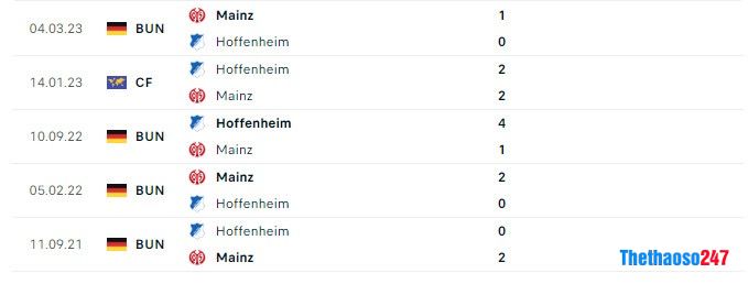 Lịch sử đối đầu giữa câu lạc bộ Hoffenheim vs FSV Mainz