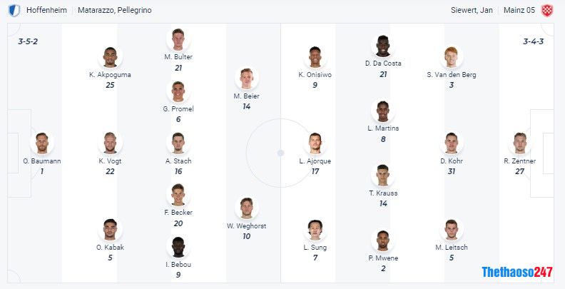 Đội hình ra sân dự kiến giữa câu lạc bộ Hoffenheim vs FSV Mainz