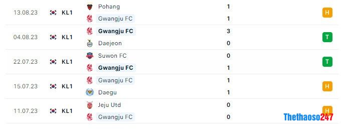 Câu lạc bộ Gwangju FC: thắng 10, hòa 8, thua 8, ghi được 33 bàn thắng, để thua 26 bàn.