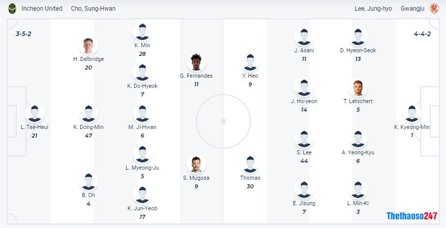 Đội hình ra sân dự kiến giữa CLB Incheon vs Gwangju FC