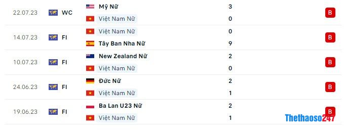 Câu lạc bộ Nữ Việt Nam 10 trận gần nhất: thắng 4, hòa 0, thua 6, ghi được 13 bàn thắng, để thua 18 bàn
