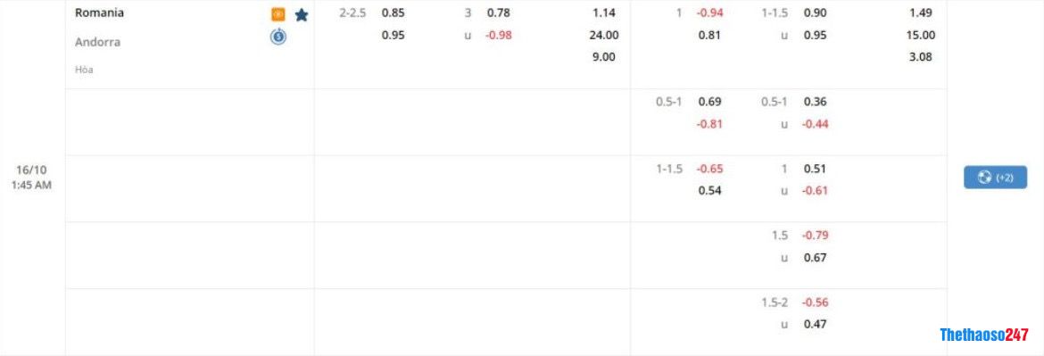 HT: Romania*1.49; Hòa*3.08; Andorra*15.00