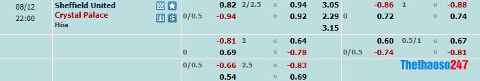 HT: Sheffield United*3.80; Hòa*1.98; Crystal Palace*3.00