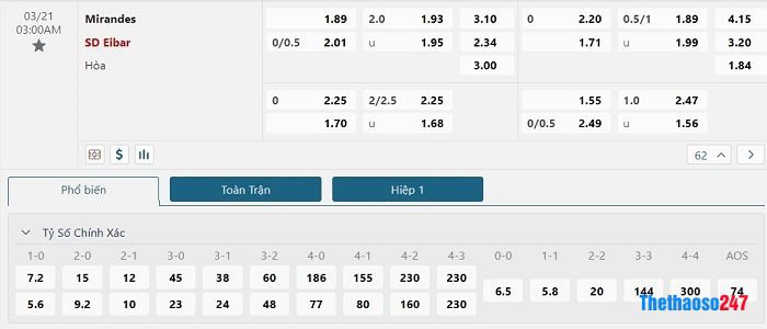 Với điểm mạnh được thi đấu trên sân nhà, Mirandes có niềm tin để chiến thắng ở cuộc đối đầu lần này, nên nhớ là đội bóng này đã có đến 7 chiến thắng, hoà 1 và chỉ để thua Alaves ở 9 lần đụng độ trên sân nhà gần đây nhất. Qua đó có được 7/9 lần thắng kèo khi gặp đối thủ này. Trong khi đó, Eibar dù đang có phong độ khá ổn định khi thắng cả 4 vòng đấu gần đây nhất nhưng đa phần những đội bóng đó đều là cửa dưới và không được đánh giá cao, cần phải nhớ là trước đó tập thể này đã để thua 2 trận liên tiếp khi gặp Alaves và Cartagena. Chính vì thế, đặt tiền cho đội chủ nhà để có tỷ lệ thắng cao.