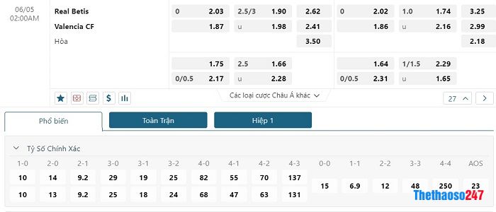 Trong 9 lần gặp nhau gần nhất giữa Real Betis và Valencia, cửa tài đã chiến thắng trong 7 trận. Mặc dù hàng công của cả hai đội không ổn định trong thời gian gần đây, tuy nhiên, người hâm mộ vẫn kỳ vọng vào một trận đấu sôi động giữa hai đội trong vòng đấu cuối cùng. Mức kèo 2 3/4 không quá khó để vượt qua, đặc biệt khi Real Betis đã không còn mục tiêu cụ thể và có thể sẽ thi đấu cởi mở hơn thông thường.
