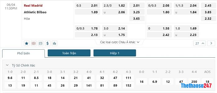 Kèo tỷ số H1 Real Madrid vs Athletic Bilbao: 1-0