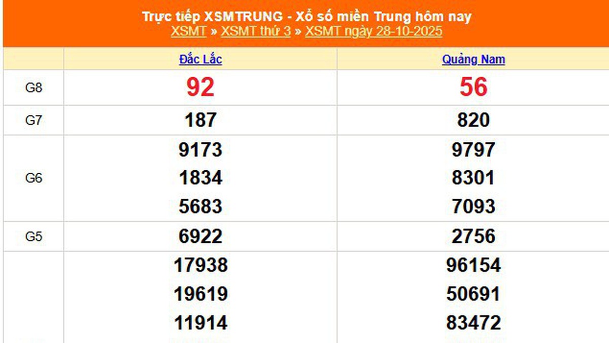 Kết quả xổ số miền Trung ngày 28/10/2025 đã chính thức được công bố vào lúc 17h15, bao gồm hai đài phát hành là Đắk Lắk và Quảng Nam. Các giải thưởng từ Giải nhất đến Giải tám, cùng với giải Đặc...