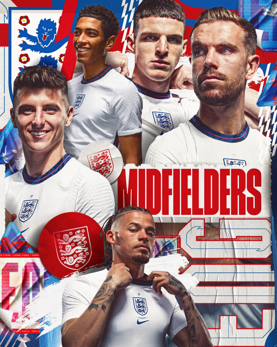 Ở hàng tiền vệ, chỉ có James Ward-Prowse của Southampton bị loại. Southgate đã giành cơ hội cho Jude Bellingham, cầu thủ mới chỉ bước sang tuổi 17 nhưng đã thể hiện rất tốt ở Borussia Dortmund mùa giải vừa qua. Bên cạnh đó, đội trưởng Jordan Henderson cũng đã được triệu tập, dù mắc phải chấn thương và chưa chơi một trận bóng đỉnh cao nào từ tháng 2 năm nay. Những cái tên còn lại là Declan Rice, Mason Mount và Kalvin Phillips.