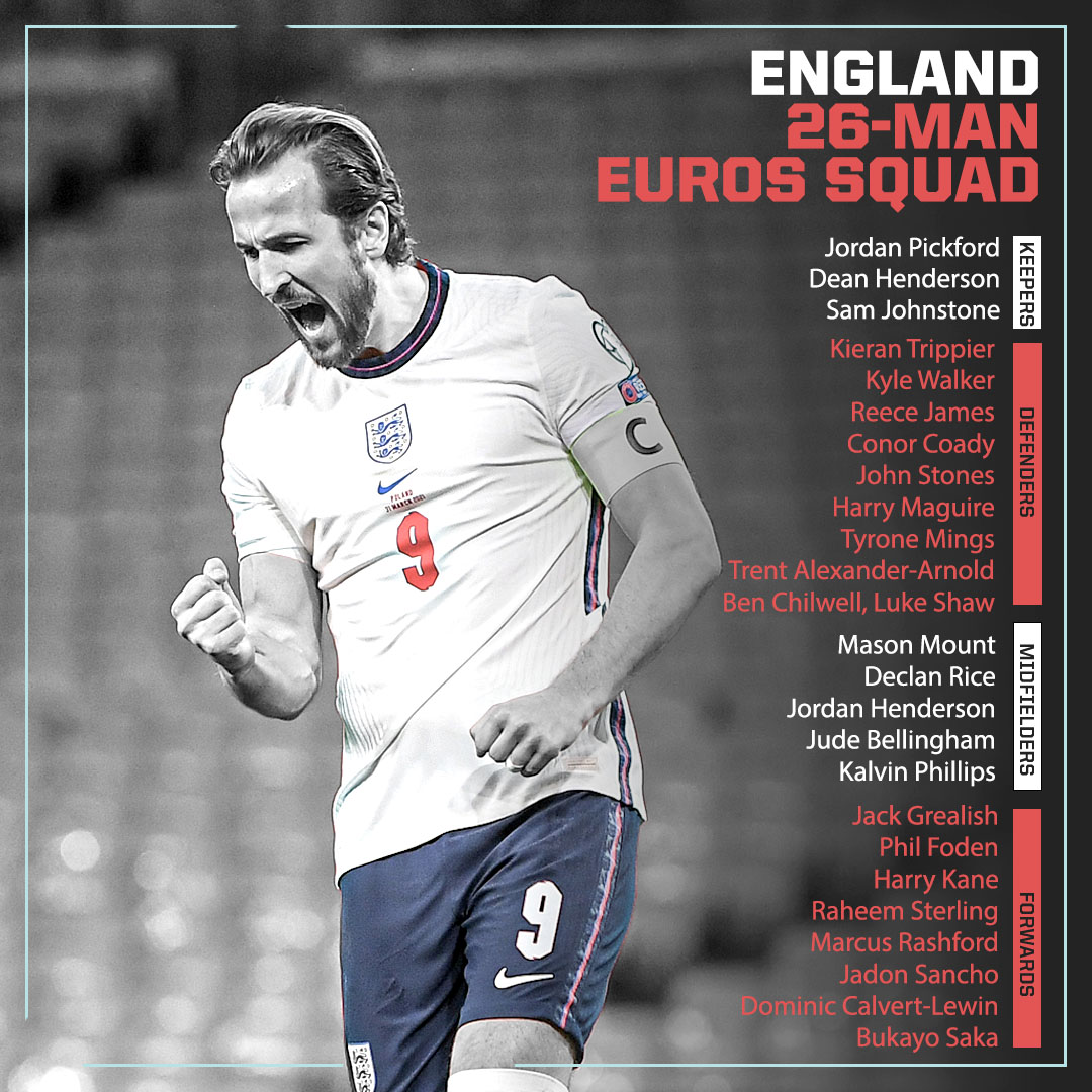 Tiền đạo: Harry Kane (Tottenham), Marcus Rashford (Man Utd), Raheem Sterling (Man City), Dominic Calvert-Lewin (Everton), Phil Foden (Man City), Jack Grealish (Aston Villa), Jadon Sancho (Borussia Dortmund), Bukayo Saka (Arsenal)