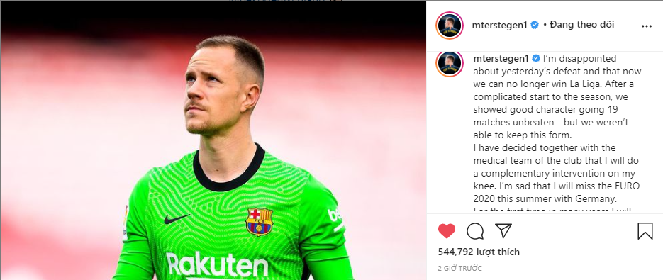 Cách đây vài giờ(theo giờ Việt Nam), thủ thành số 1 của Barcelona, Marc-André ter Stegen đã đăng trên trang cá nhân Instagram xác nhận về việc mình sẽ bỏ lỡ kỳ EURO mùa hè năm nay.